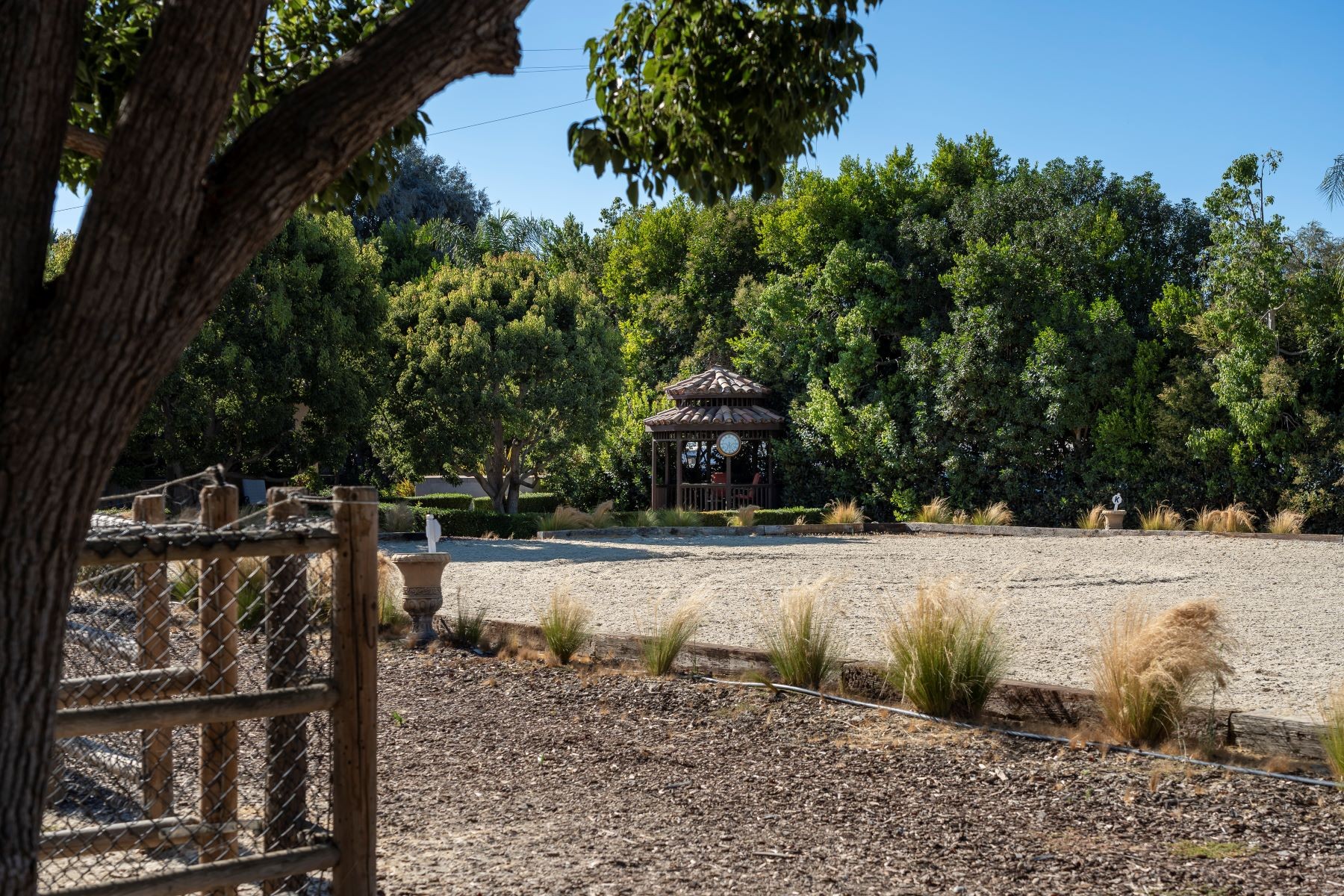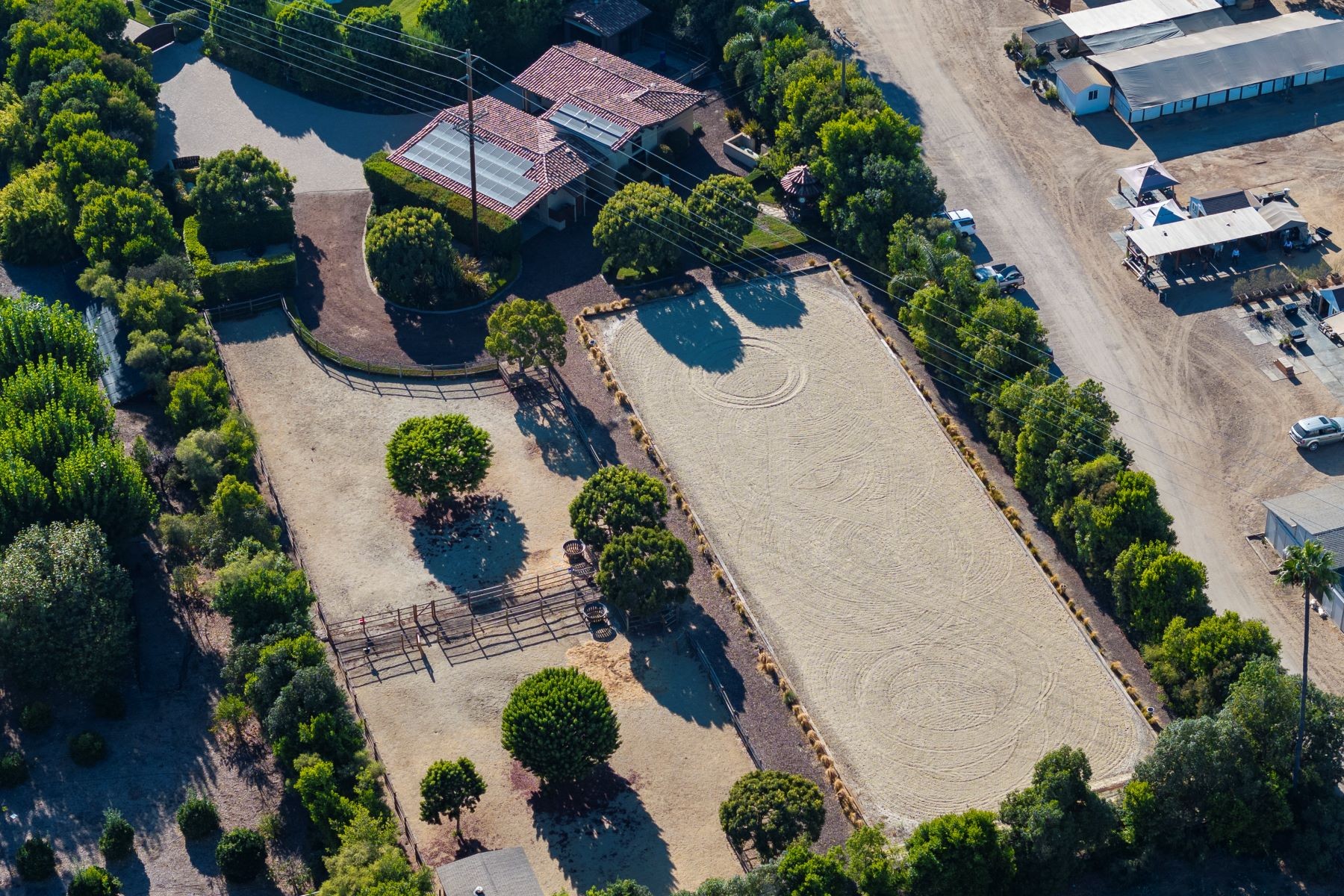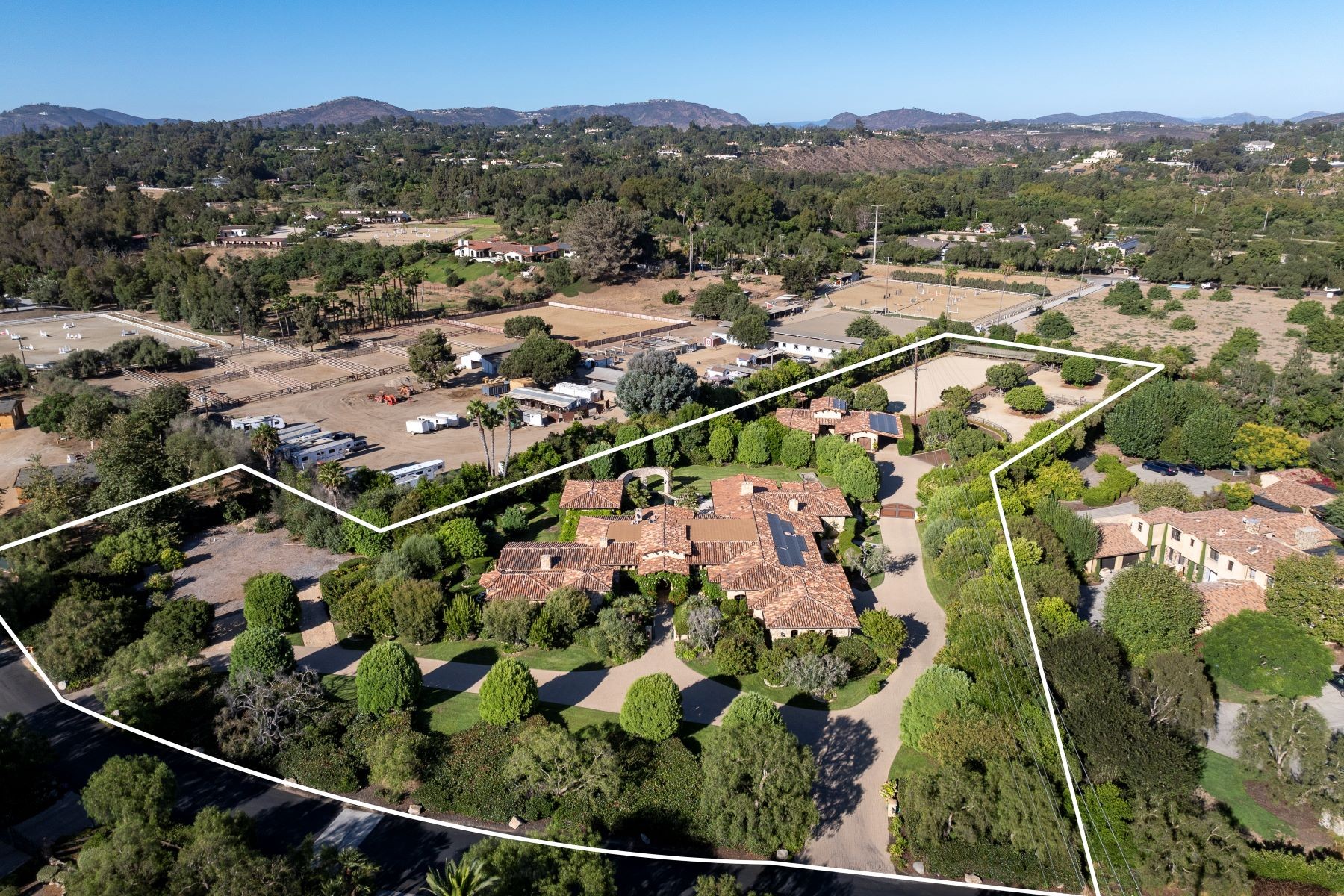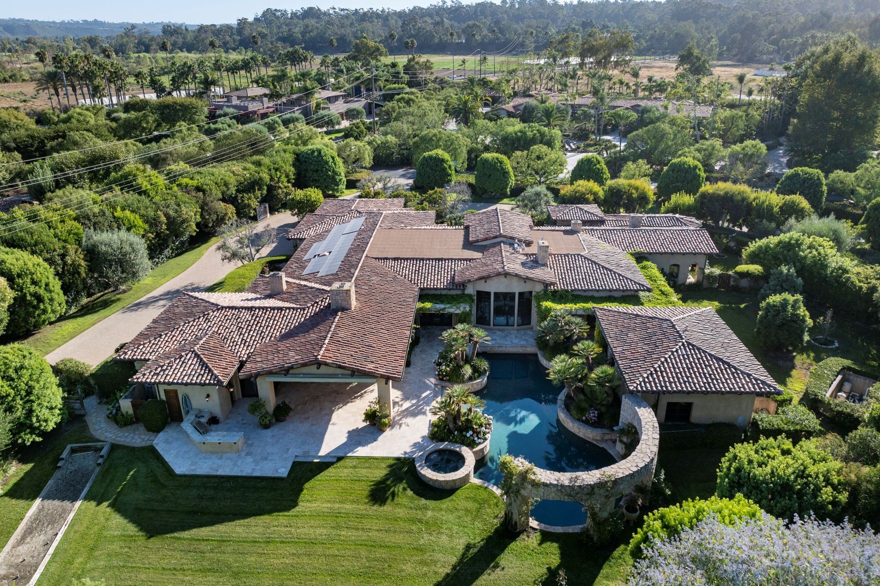 Welcome to an exclusive equestrian estate in the prestigious Rancho Santa Fe Covenant, where luxury meets elegance in a custom single-level residence. The captivating entry opens to a formal living and dining room, both overlooking 3.72 acres of beautifully landscaped grounds, including a resort-style pool with a water feature and elevated spa. This home showcases impeccable craftsmanship throughout, with hardwood floors, soaring coffered ceilings, and elegant wood paneling. The main house features four ensuite bedrooms and a serene master retreat, complete with a fireplace, a claw-footed tub, a spacious glass-enclosed shower, and a grand custom walk-in closet. The gourmet chef's kitchen is outfitted with top-tier Viking and SubZero appliances, a copper sink, a Miele espresso machine, and a custom stone exhaust hood. Boasting a 1,000-bottle temperature-controlled wine room, a billiards room with a custom bar, an executive home office/library, and a family room with a hidden movie screen. French doors lead to a fully fenced backyard with a built-in BBQ, outdoor kitchen, pool/spa, bocce ball court, and multiple seating areas. Additional highlights include a one-bedroom, one-bath detached guest house. The property also includes a four-car garage, a citrus orchard, solar panels, and a reverse osmosis water system. Equestrian enthusiasts will appreciate the world-class stables with three oversized padded stalls, a spacious tack room, and a full-sized mirrored dressage court with premier footing.
