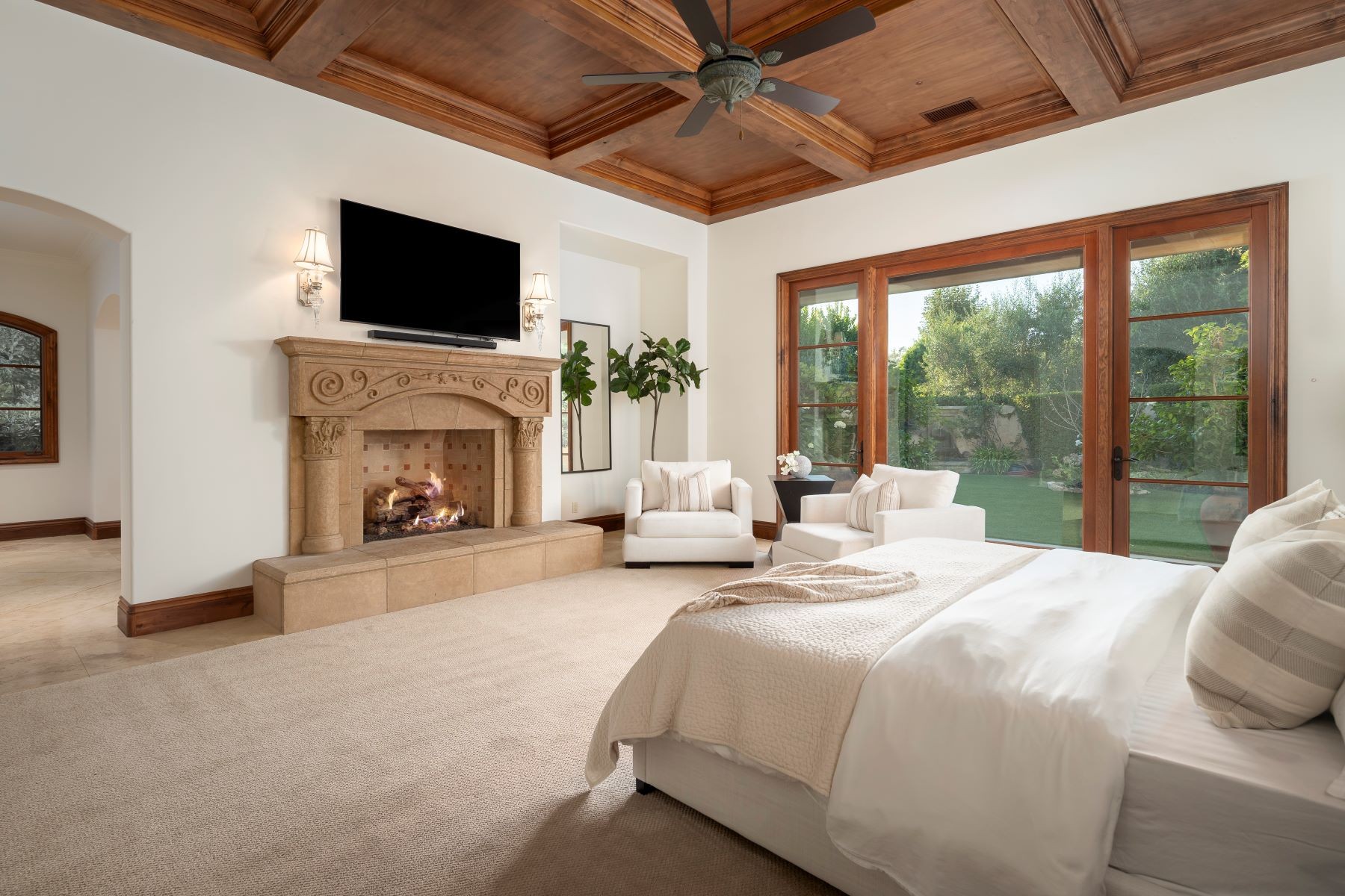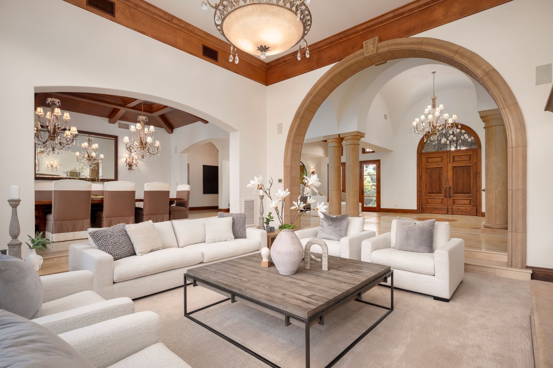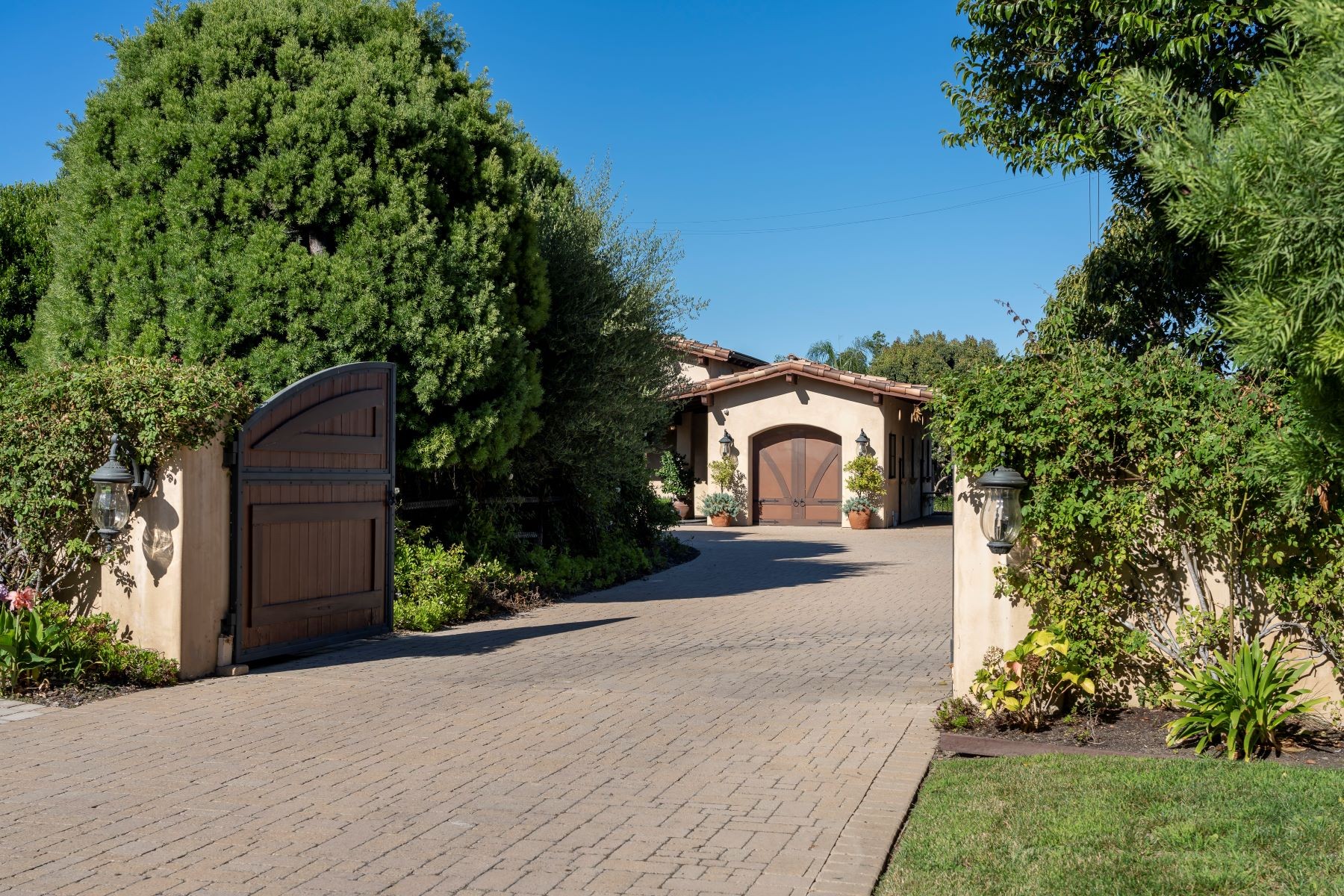 Welcome to an exclusive equestrian estate in the prestigious Rancho Santa Fe Covenant, where luxury meets elegance in a custom single-level residence. The captivating entry opens to a formal living and dining room, both overlooking 3.72 acres of beautifully landscaped grounds, including a resort-style pool with a water feature and elevated spa. This home showcases impeccable craftsmanship throughout, with hardwood floors, soaring coffered ceilings, and elegant wood paneling. The main house features four ensuite bedrooms and a serene master retreat, complete with a fireplace, a claw-footed tub, a spacious glass-enclosed shower, and a grand custom walk-in closet. The gourmet chef's kitchen is outfitted with top-tier Viking and SubZero appliances, a copper sink, a Miele espresso machine, and a custom stone exhaust hood. Boasting a 1,000-bottle temperature-controlled wine room, a billiards room with a custom bar, an executive home office/library, and a family room with a hidden movie screen. French doors lead to a fully fenced backyard with a built-in BBQ, outdoor kitchen, pool/spa, bocce ball court, and multiple seating areas. Additional highlights include a one-bedroom, one-bath detached guest house. The property also includes a four-car garage, a citrus orchard, solar panels, and a reverse osmosis water system. Equestrian enthusiasts will appreciate the world-class stables with three oversized padded stalls, a spacious tack room, and a full-sized mirrored dressage court with premier footing.