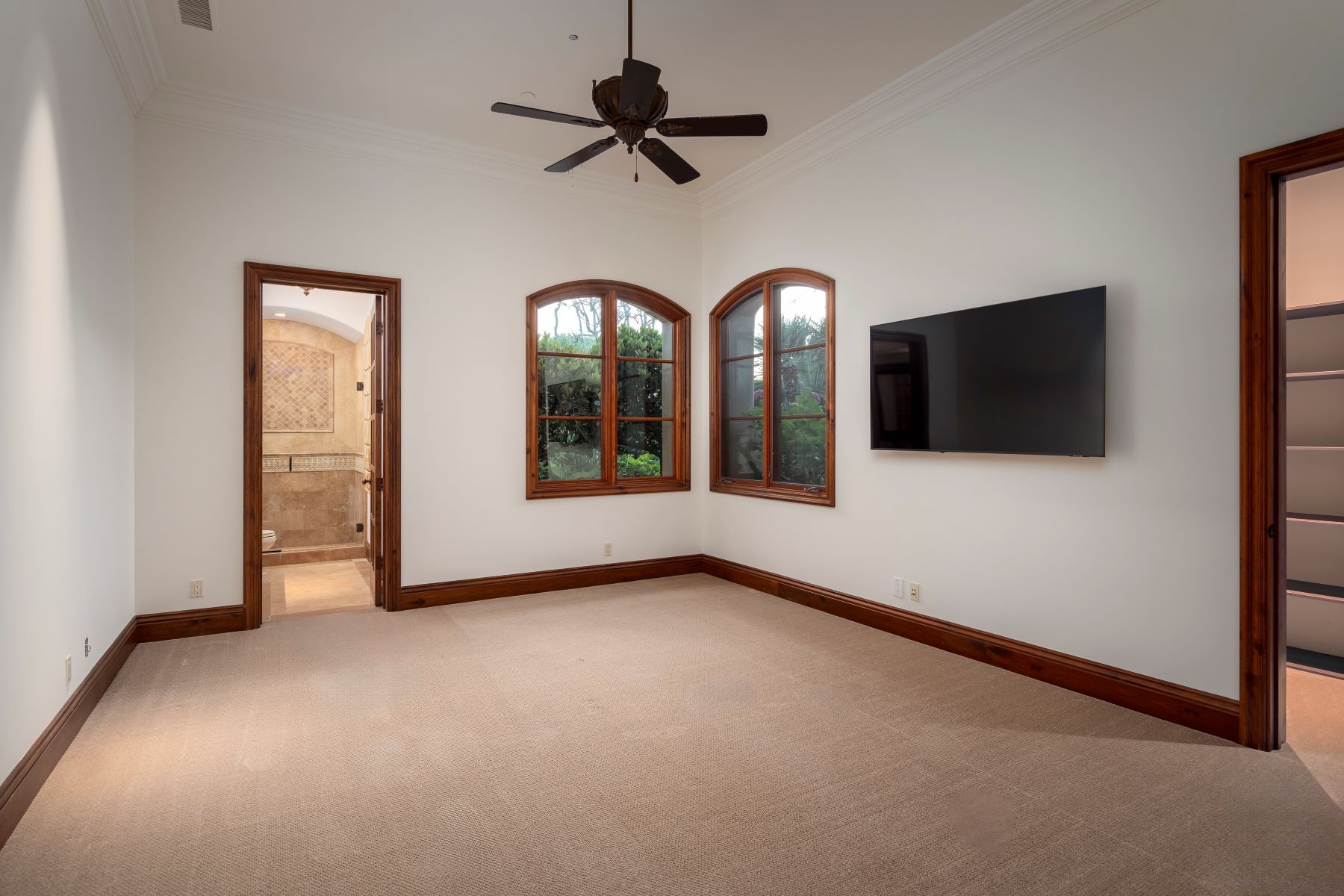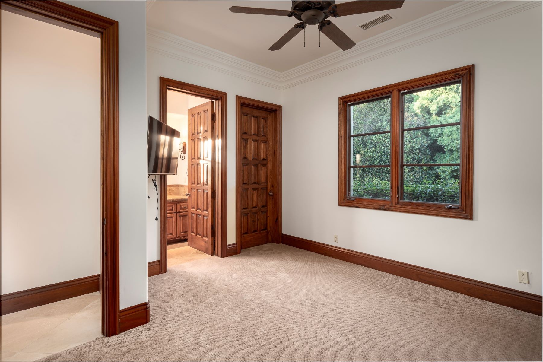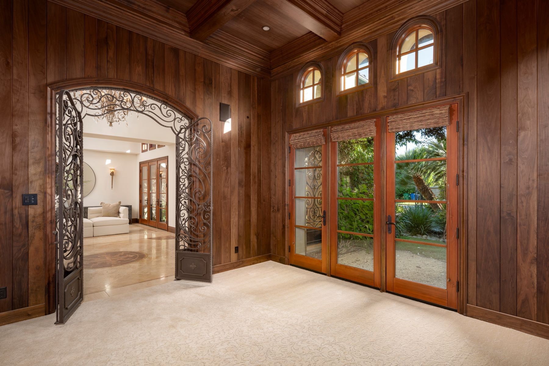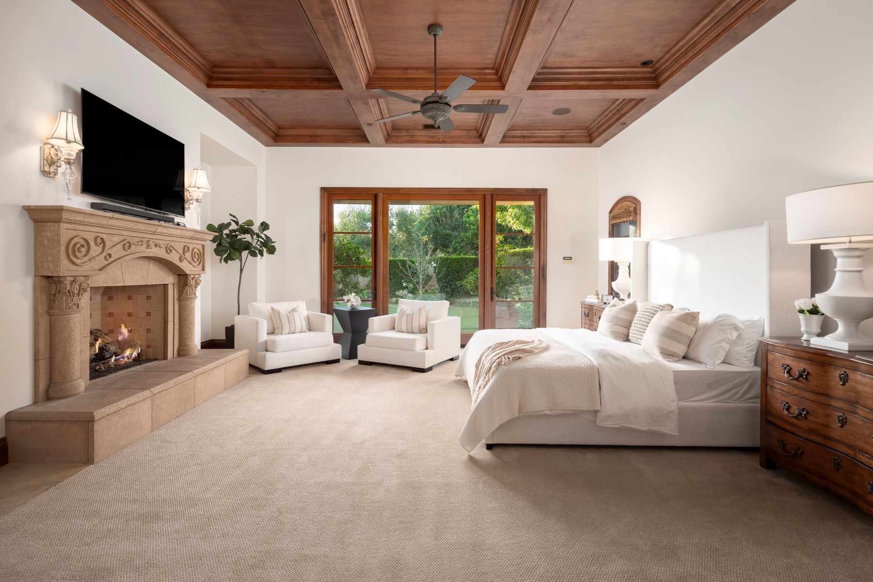 Welcome to an exclusive equestrian estate in the prestigious Rancho Santa Fe Covenant, where luxury meets elegance in a custom single-level residence. The captivating entry opens to a formal living and dining room, both overlooking 3.72 acres of beautifully landscaped grounds, including a resort-style pool with a water feature and elevated spa. This home showcases impeccable craftsmanship throughout, with hardwood floors, soaring coffered ceilings, and elegant wood paneling. The main house features four ensuite bedrooms and a serene master retreat, complete with a fireplace, a claw-footed tub, a spacious glass-enclosed shower, and a grand custom walk-in closet. The gourmet chef's kitchen is outfitted with top-tier Viking and SubZero appliances, a copper sink, a Miele espresso machine, and a custom stone exhaust hood. Boasting a 1,000-bottle temperature-controlled wine room, a billiards room with a custom bar, an executive home office/library, and a family room with a hidden movie screen. French doors lead to a fully fenced backyard with a built-in BBQ, outdoor kitchen, pool/spa, bocce ball court, and multiple seating areas. Additional highlights include a one-bedroom, one-bath detached guest house. The property also includes a four-car garage, a citrus orchard, solar panels, and a reverse osmosis water system. Equestrian enthusiasts will appreciate the world-class stables with three oversized padded stalls, a spacious tack room, and a full-sized mirrored dressage court with premier footing.