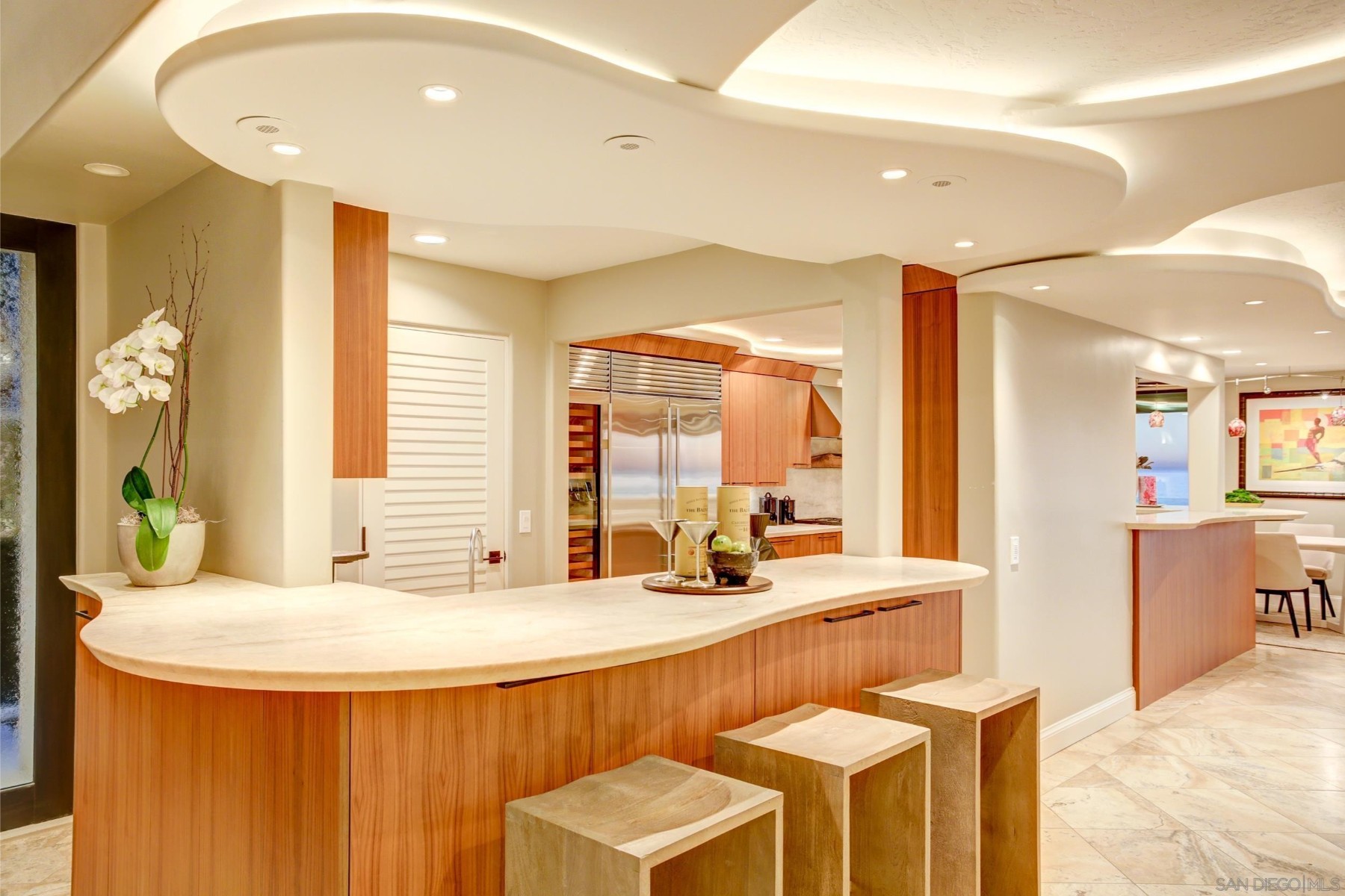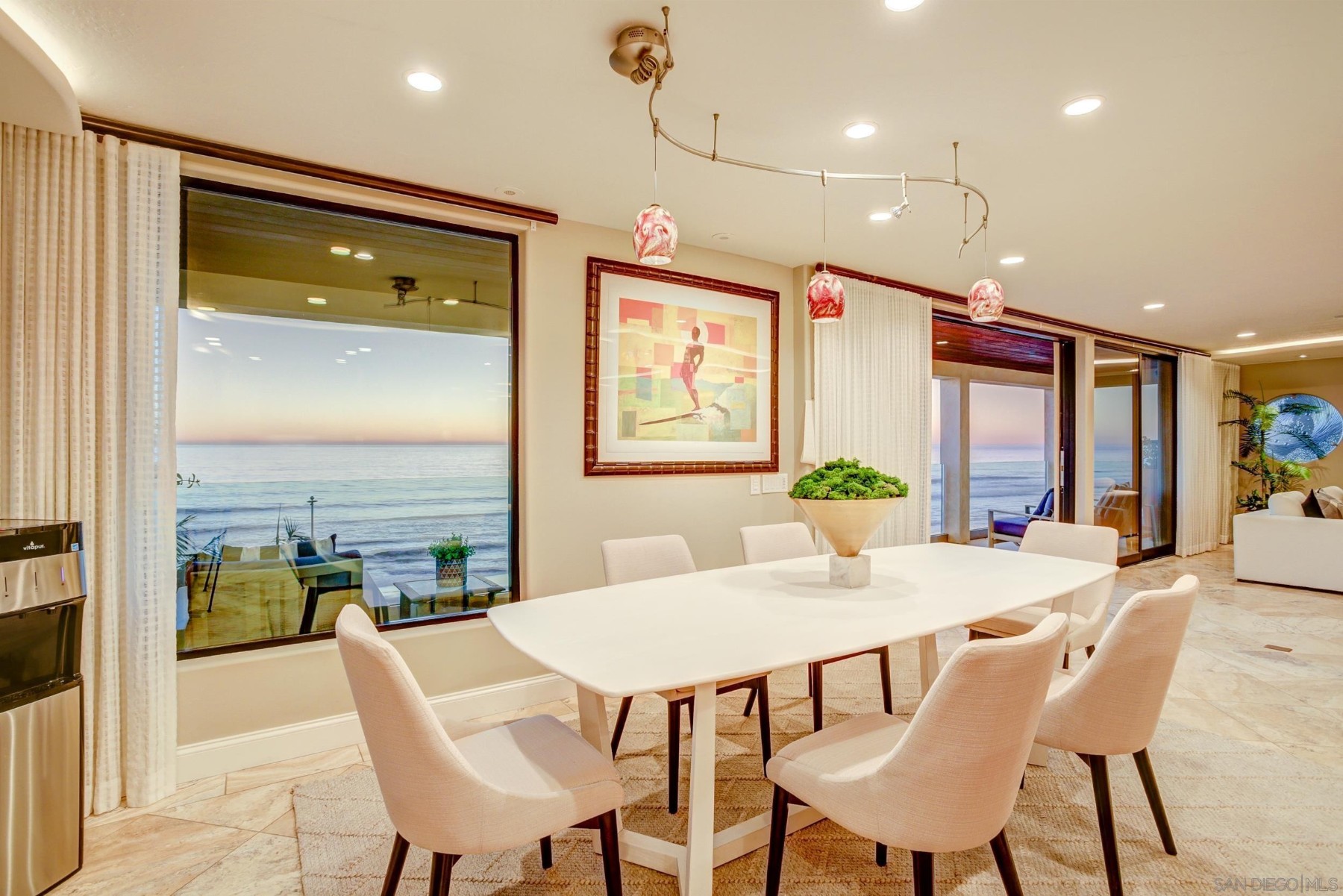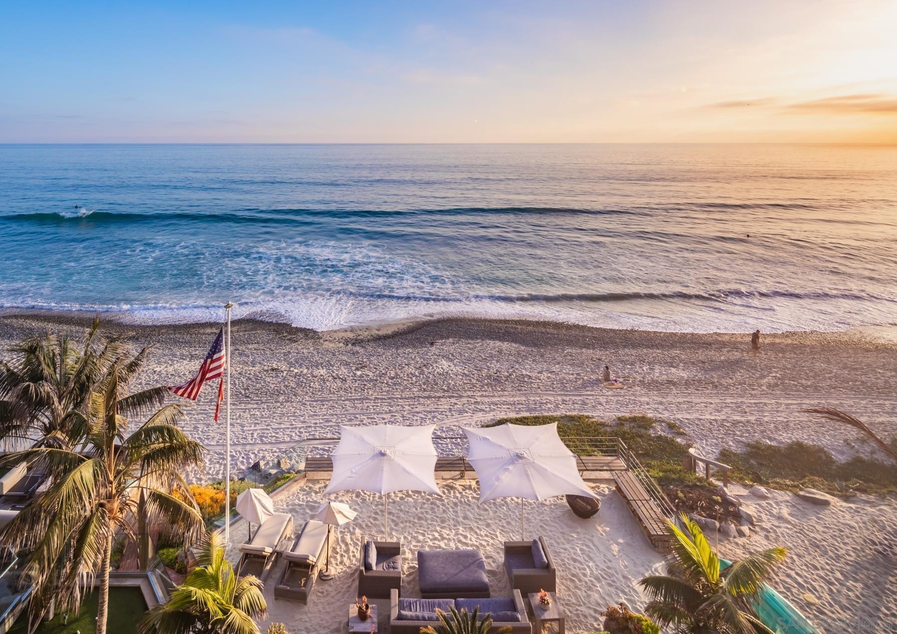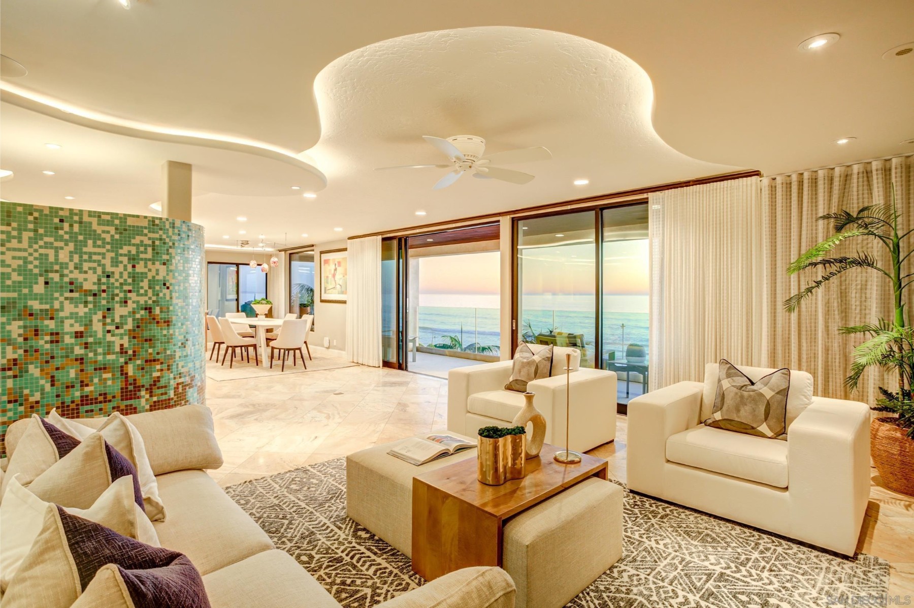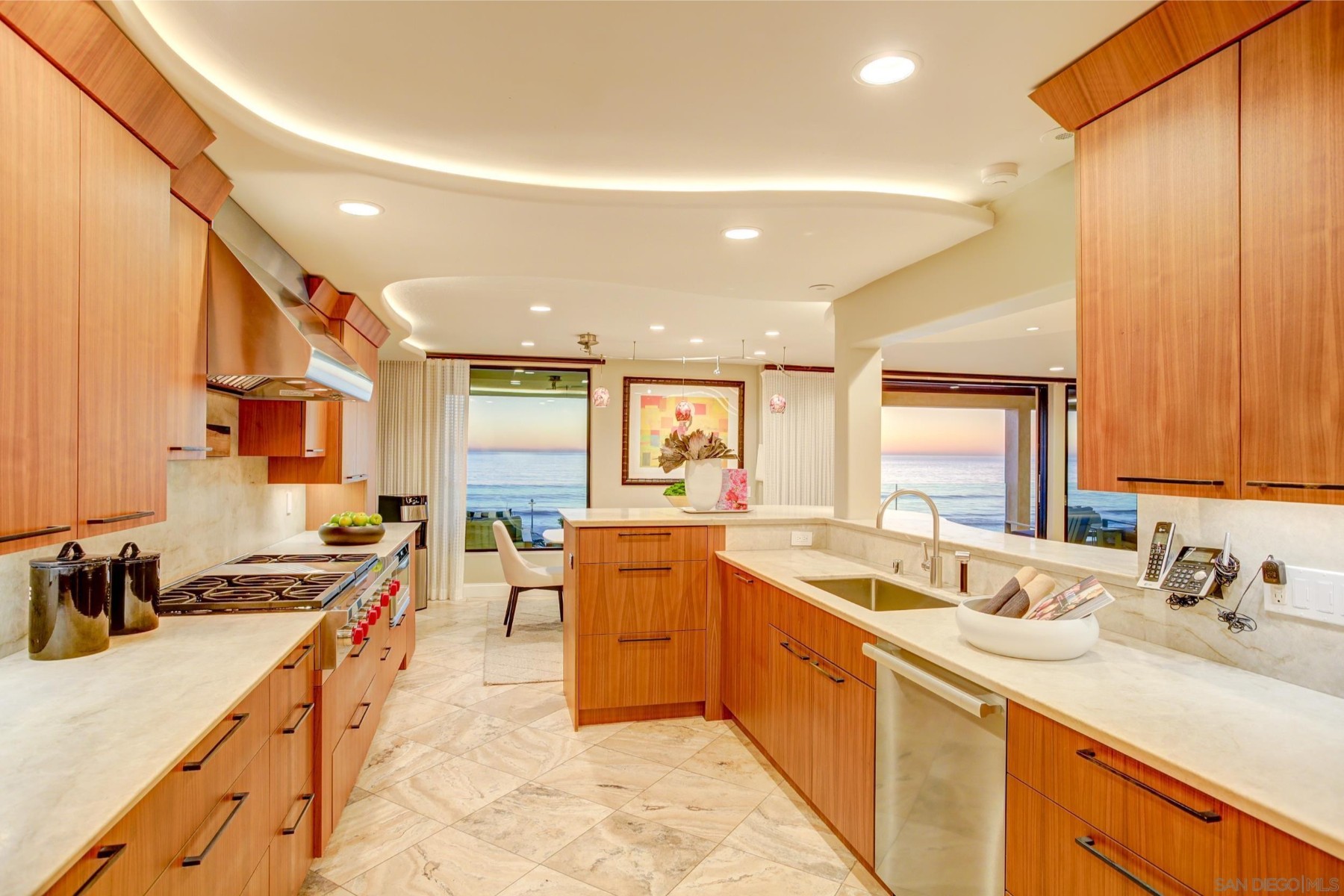 Oceanfront estate with panoramic water views directly on the sands of the most pristine stretch of beach in Carlsbad. 2641 Ocean Street, a beautifully designed 3 story home, with 5 bedrooms, 6 bathrooms and a separate one-bedroom downstairs guest suite sitting at nearly 6,200 sqft total. This home embodies a coastal design throughout, with state-of-the-art upgrades that take this residence to the next level. The entry level features a gourmet kitchen that includes Wolf and Subzero appliances, every element of this homes design defines luxury. An open floor plan with sliding glass doors to 3 patio areas allows for the ocean breeze to seamlessly spread throughout the home. Relax in the inviting living room with carved limestone fireplace and sliding wood and glass doors that open completely to the view deck, creating a large indoor/outdoor space. The spiral staircase & elevator provides access to all levels including the downstairs guest quarters. The upstairs level offers a Master suite with office/bedroom ensuite, stone fireplace and spacious walk-in closet. There are 3 additional bedrooms on this level as well as a home theater with an entertainment bar area. The private lower-level Guest Apartment includes a full kitchen with a walk out patio overlooking the Pacific Ocean. The highest-grade technology throughout including: Control4 smart home, commercial grade wifi & security. A spectacular backyard made for entertaining, with an outdoor kitchen, just steps away from the ocean water beautifully upgraded by Award Winning designer Wolfram Kalber.