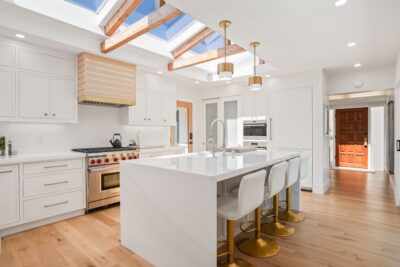 The heart of the home, the fully remodeled kitchen, is both functional and stylish. It features high-end stainless steel appliances, marble countertops, and a large island. Custom white oak cabinetry and a skylight add warmth and natural light.