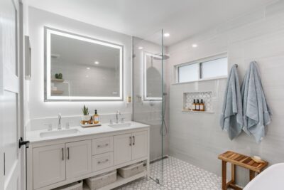 The spa-like primary bathroom offers a dual vanity, light-up mirrors, and a walk-in shower. Elegant fixtures and finishes make it a true retreat.