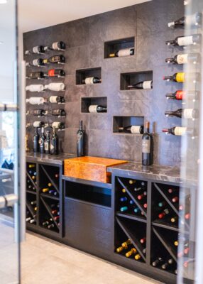 The lower level offers a family room and a custom wine room. Outside, enjoy the luxurious pool and hot tub with stunning ocean views.