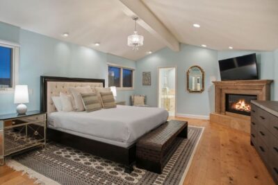 The expansive primary bedroom is a luxurious retreat within the home, complete with a seating area and a fireplace, offering a private haven for relaxation.